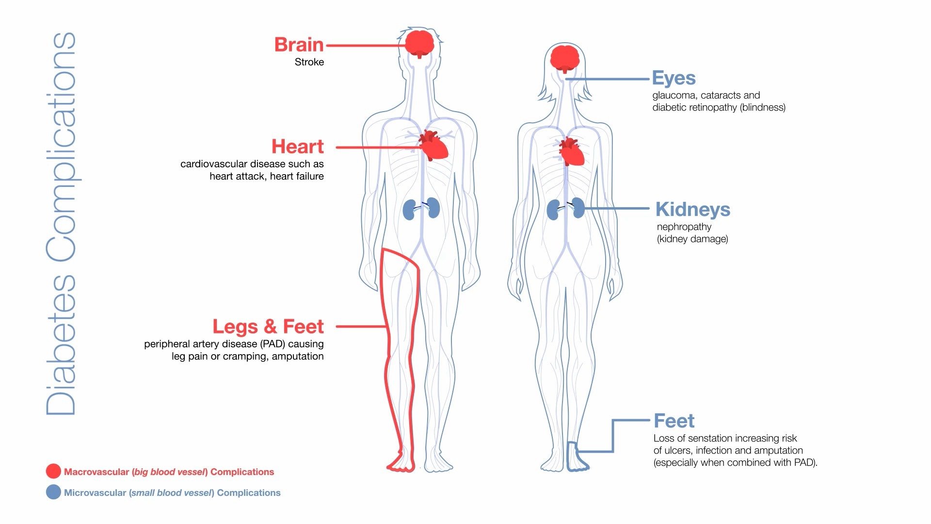 Diabetes affects blood vessels. The complications that happen because of harm to the blood vessels can be divided into effects on large blood vessels (macrovascular), and complications from harm to small blood vessels (microvascular).